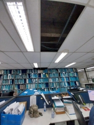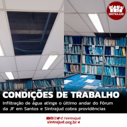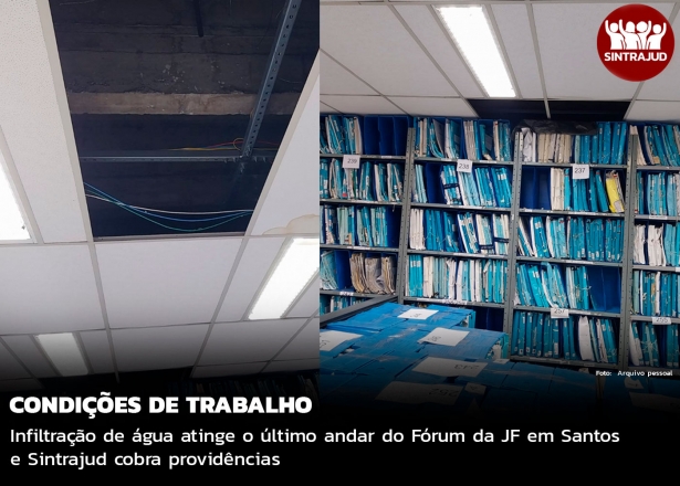 O retorno do recesso dos servidores da 5.ª e 6.ª Varas da Justiça Federal de Santos foi marcado por infiltração de água das chuvas nas Varas localizadas no último andar do Fórum Federal Prof. José Frederico Marques, na cidade de Santos. Nas fotos recebidas pelo Sintrajud, na quinta-feira (09), é possível visualizar goteiras, infiltrações e até a retirada de parte do forro das Secretarias das Varas, que ficaram molhados. Confira a galeria de fotos no final do texto.No dia anterior o estrago havia sido pior ainda, com fluxo maior de água caindo do teto, molhando computadores, mobiliário e expondo os servidores ao risco de curto-circuito e queda de forros.Diante da infiltração ocorrida no último andar do Fórum, os funcionários da 5.ª Vara Federal tiveram que ser remanejados para trabalhar de forma improvisada na sala da Central de Mandados, localizada no 1.º andar. A cobertura do edifício está em obras - cobradas pelos servidores por há pelo menos 10 anos - entretanto, a obra de impermeabilização do teto iniciada em agosto de 2024 se arrasta e não tem data para ser concluída.O Sintrajud encaminhou, na última sexta-feira (10), uma petição com a finalidade de pedir informações sobre o ocorrido e providências que estejam sendo adotadas em relação à segurança do edifício e às condições de trabalho, bem como para que seja assegurado teletrabalho para os servidores lotados na 5.ª e 6.ª Varas, cujas Secretarias vêm sofrendo reiteradas infiltrações, gerando riscos à saúde e à segurança de todos os que trabalham e circulam no ambiente. Galeria de fotos da 5.ª e 6.ª Varas Federais de Santos nesta quinta-feira (09):[gallery size="medium" ids="76322,76323,76324,76325,76326,76327,76328,76329,76330,76331,76332,76333"]