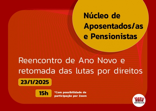 O Núcleo de Aposentados retoma suas atividades com sua primeira reunião de 2025 nesta quinta-feira (23) às 15h. O encontro será realizado presencialmente na sede do Sintrajud e também online pela plataforma Zoom.Acesse aqui a sala virtual da reunião do núcleoPara a dirigente Ana Luiza Figueiredo, como os aposentados não estão mais em seus locais de trabalho, o Núcleo é um espaço de luta e de convivência comum. Entre os assuntos que serão abordados estão as lutas gerais e específicas dos servidores. Serviço:Reunião do Núcleo de AposentadosData: 23/01Horário: 15hLocal: Presencial na Sede do Sintrajud - Rua Antônio de Godói , 88 – 16º andar – Centro São Paulo/SPOnline pela Plataforma Zoom