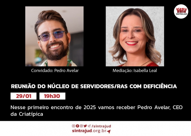 Na primeira reunião do ano do Núcleo de Servidores/as com Deficiência, a diretora do Sintrajud, Isabella Leal, servidora do Núcleo de Apoio Assistencial do TRT2, recebe o convidado Pedro Avelar (Peu). A atividade será realizada nesta quarta-feira (29), às 19h30, pela plataforma Zoom e tem como tema a deficiência psicossocial: TEA, TDAH e outras neurodivergências.Clique aqui para entrar na reunião!Pedro Avelar, que também é conhecido como Peu, se apresenta como um homem cis, branco, gay e neurodivergente; que acredita no poder da diversidade como motor de inovação. Formado em Relações Internacionais com especialização em Direitos Humanos, ele é CEO da Criatipica; fundador da Parada PCD e do Festival Ervas; e atua na agenda ESG (Governança Social e Ambiental) com consultoria estratégica, produção de eventos, palestras e mentorias.Participe do grupo de WhatsApp do Núcleo de Servidores/as com Deficiência clicando aqui!Serviço:Reunião do Núcleo de Servidores/as com DeficiênciaData: 29/01Horário: 19h30Local: online pela plataforma Zoom#praquetodosvejam - Imagem com fundo preto, foto do lado esquerdo superior de um homem branco de cabelo curto, barba e óculos escuros, com letreiro abaixo: Pedro Avelar foto do lado direito superior de uma mulher branca, com cabelos louros com altura próxima ao ombro, blusa vermelha e letreiro abaixo: Isabella Leal. Letreiro abaixo: Reunião do Núcleo de Servidores/as com Deficiência; 29/01; 19h30; Nesse primeiro encontro de 2025 vamos receber Pedro Avelar, CEO da Criatípica.