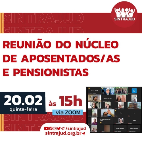 A reunião do Núcleo de Aposentados e Pensionistas do Sintrajud será realizada nesta quinta-feira (20), às 15h. O encontro será realizado on-line pela plataforma Zoom. Em pauta, a retomada das atividades culturais, as ações de luta do Sindicato e a participação do Núcleo na próxima reunião do Conselho de Base.Clique aqui para acessar a reunião!Após a reunião, também de forma on-line, acontece a aula de dança, com o professor Diego Carlos Bellarosa. As aulas são abertas e gratuitas para sindicalizados. Participe e aproveite!