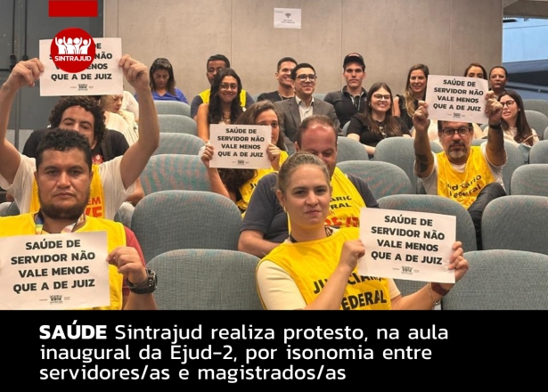 Trabalhadoras e trabalhadores do judiciário federal realizaram um protesto organizado pelo Sindicato, na aula inaugural da EJud-2, nesta sexta-feira (14). O ato foi motivado pela presença da ministra do TST: Kátia Magalhães Arruda; do ministro do TST e conselheiro do CSJT, Claudio Mascarenhas Brandão; e do coordenador do Fórum Permanente de Gestão da Carreira dos Servidores do PJU e conselheiro do CNJ, Guilherme Guimarães Feliciano. Manifestantes levantaram cartazes e entoaram palavras de ordem pela garantia da isonomia do auxílio saúde nos mesmos termos oferecidos à magistratura.Participaram da manifestação Camila Oliveira Gradin e Ismael Souza, dirigentes do Sintrajud; o diretor da Fenajufe, Fabiano dos Santos, diretores de base; e várias servidoras e servidores do judiciário. A diretora Camila avaliou a relevância desse protesto. “Nossa manifestação no evento foi importante pois conseguimos dar visibilidade para nossa pauta e conversar com ministro Brandão do CSJT, antes do auxílio saúde entrar na pauta do conselho no dia 31/3”.Durante a conversa com o ministro Brandão, a oficiala de justiça Matilde Gouveia perguntou se ele acha legítima a equiparação do auxílio saúde do servidor com o magistrado. E a resposta de Brandão foi categórica: “eu acho legítima a isonomia sim!” O diretor de base Fabiano pontuou ao ministro que: “a nossa reivindicação é muito simples e objetiva: isonomia do teto, no piso e efetivo valor”. Camila falou sobre o diálogo que eles tiveram com o conselheiro Feliciano: “reiteramos também ao conselheiro Dr. Feliciano, do CNJ, que não vamos descansar até termos a isonomia que muitos da magistratura concordam, mas nas normas não se realizam, nem nas do CNJ e nem do CSJT.”O Sintrajud vai protocolar memoriais junto ao gabinete do ministro Brandão, com o teor da reivindicação pela isonomia no âmbito do CSJT e solicitar uma reunião, com a qual ele se comprometeu a atender. Também será reiterado o pedido de isonomia no âmbito do CNJ, já que o processo sobre esse assunto está aguardando um parecer do conselheiro Feliciano.