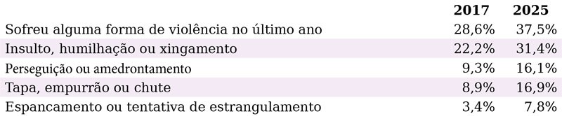 Nesse mês que marca o Dia Internacional das Mulheres, o Fórum Brasileiro de Segurança Pública (FNSP), publicou a 5ª edição da pesquisa ‘Visível e Invisível: a Vitimização de Mulheres no Brasil’, cujos dados demonstram o aumento no percentual de violência de gênero desde 2017. A estimativa global da Organização Mundial da Saúde (OMS) quanto ao índice de prevalência de violência física ou sexual provocada por parceiro e/ou ex-parceiro, é de 27%, de acordo com dados de 2021. No Brasil, esse percentual é de 32,5%, de acordo com a pesquisa realizada em fevereiro de 2025.Este estudo, cuja abrangência é nacional, revela dados alarmantes sobre os percentuais e tipos de violência sofrida pelas mulheres. A pesquisa foi realizada por meio de entrevistas, com uma amostra de cerca de 2 mil pessoas, das quais mais da metade são mulheres.As perguntas foram divididas em quatro temas: conhecimento sobre a violência no bairro ou comunidade, violência provocada por parceiro íntimo ao longo da vida; controle coercitivo nas relações íntimas ao longo da vida; violência provocada por parceiro íntimo ao longo da vida; e violências sofridas nos últimos 12 meses. Perfil das mulheres vítimas de violênciaConsiderando o universo de mulheres vítimas de violência os percentuais são: Percepções sobre a violência contra mulheresDe acordo com a pesquisa, 55,6% dos brasileiros já ouviram ou presenciaram, pelo menos, uma ocorrência de violência contra meninas e/ou mulheres nos últimos 12 meses, cujos autores eram, parceiros íntimos, familiares ou desconhecidos. Os episódios mais relatados foram as abordagens desrespeitosas na rua, com índice de 38,2%; e xingamentos e humilhações praticados por homens contra suas parceiras ou ex-parceiras íntimas, somando 35,6% dos relatos.Analisando o perfil de gênero das respostas, os resultados indicam que as mulheres têm maior percepção da violência: 33,4%, entre os homens esse percentual é de 20,5%. Essa diferença pode significar que eles vivenciaram menos episódios de violência, ou, que a percepção masculina para o reconhecimento de contextos violentos contra as mulheres é menor.Dessa maneira, o estudo discorre que: “isso aconteceria mesmo quando a violência se apresenta de maneira explícita, como nos casos de agressões cometidas por companheiros, ex-companheiros ou familiares do sexo masculino, mas também em casos de outros tipos de violência, diferentes da física, cuja identificação como violência ainda é menos óbvia para grande parte da população”. Violência provocada por parceiro ao longo da vidaApenas as mulheres entrevistadas responderam questões sobre vitimização, dentre as quais 32,4% das brasileiras acima dos 16 anos informaram que sofreram violência física ou sexual praticada por parceiro ou ex-parceiro íntimo.O estudo também relata que, ao menos 23,4 milhões de brasileiras sofreram agressões psicológicas: “quando incluímos as situações de violência psicológica vivenciadas, tais como “insultos, xingamentos e humilhações” ou “ter sido forçada a ficar sozinha por um longo período de tempo, ou impedida de se comunicar com amigos e familiares”, a prevalência de brasileiras que experimentaram violência por parte de parceiro íntimo ou ex-parceiro íntimo ao longo da vida chega a 40,7% das mulheres com 16 anos ou mais”.No recorte de dados de cada população, ou seja, o percentual para cada grupo separado por perfil, os maiores índices de mulheres vítimas de violência ao longo da vida são: