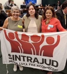 Rosana, a deputada federal Sâmia Bomfim (PSOL/SP) e Luciana Carneiro em atividade na Câmara dos Deputados durante a votação do PL 4015/2023 (Foto: Arquivo Sintrajud)