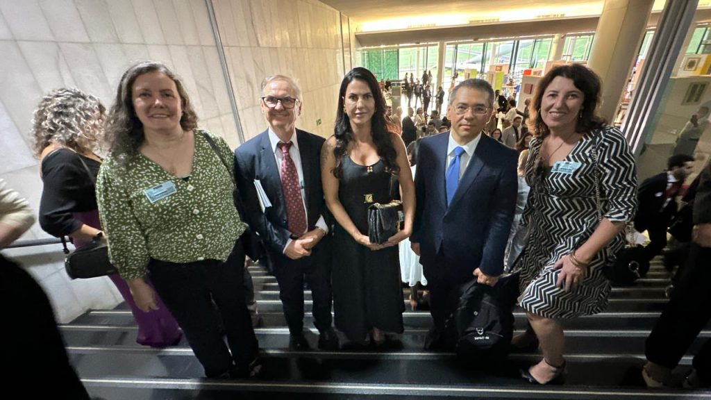 Da esquerda para a direita, as oficialas e oficiais Matilde Gouveia (TRT-2), Edmílson Aparecido Gatti (JF/CEUNI), Maria Sueli Sobrinho (TJMG), Marcos Trombeta e Marilene de Souza Nunes, ambos da JF/CEUNI na Câmara dos Deputados no dia 25 de março (Foto Valcir Araújo)