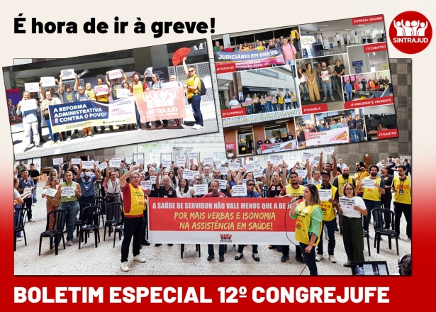 quintos na Justiça Federal e a política de “fazer mais com menos”.É preciso organizar as reivindicações numa mobilização unificada nacional, com pauta nítida e propostas concretas de ganhos. Isso só é possível com uma greve de verdade. Foi assim que a categoria arrancou a Lei da Carreira, os PCSs, as gratificações dos oficiais de justiça e agentes da polícia judiciária e os reajustes.Essa é a tarefa que a diretoria do Sintrajud e o Coletivo Nacional LutaFenajufe, do qual o Sindicato faz parte por decisão congressual, defenderá que o 12º Congrejufe assuma.