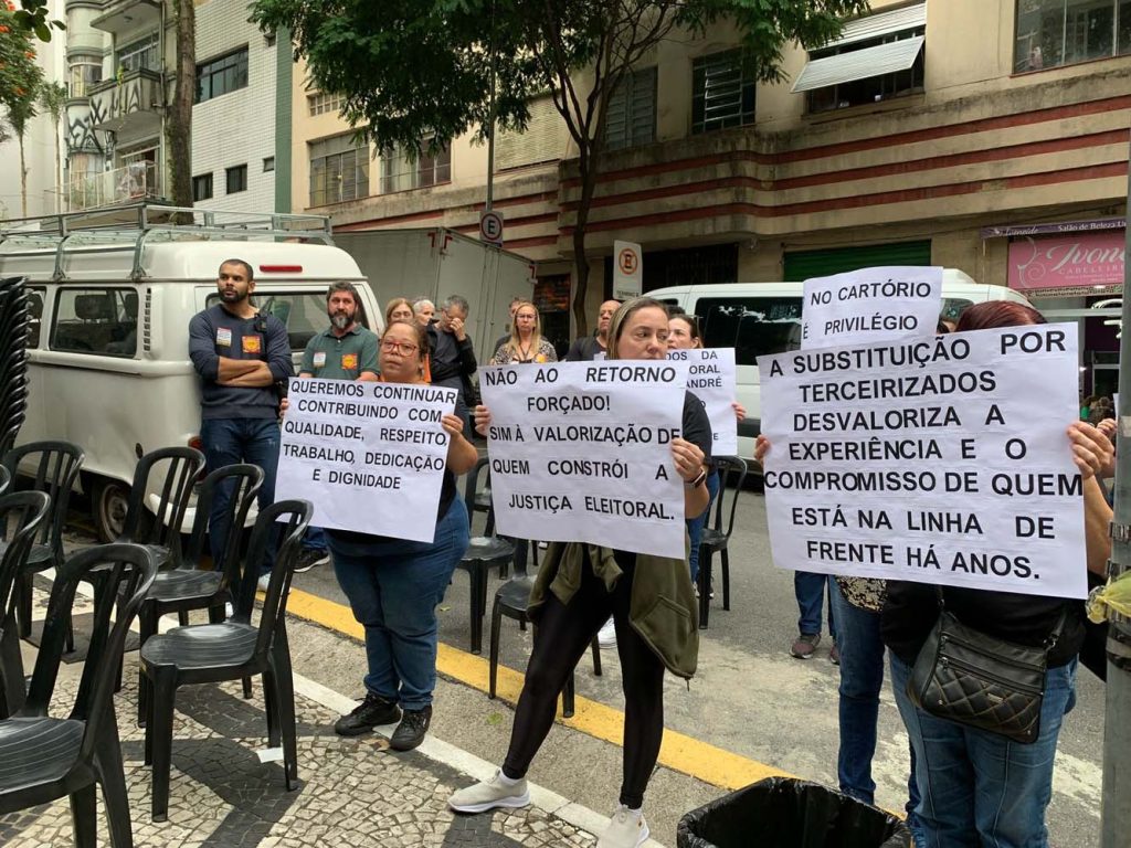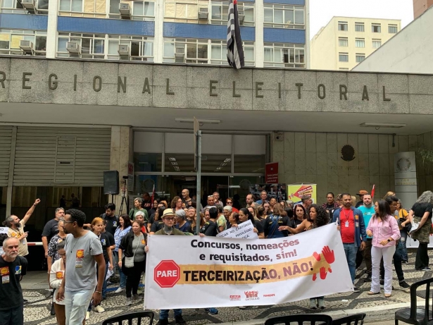 Com a participação presencial de colegas de dezenas de zonas eleitorais da capital e do ABC Paulista, a manifestação realizada nesta quinta-feira (24 de abril) em frente ao Tribunal Regional Eleitoral foi uma demonstração da indignação despertada pelo projeto privatista da administração do Regional, que pretende substituir servidores e servidoras requisitados de prefeituras, do estado e de outros órgãos federais por mão de obra terceirizada.O ato protestou contra a terceirização na Justiça Eleitoral paulista e defendeu a permanència dos/as servidores/as requisitados/as, nomeação de todos/as os/as aprovados/as no último concurso e criação de novos cargos no Tribunal Regional Eleitoral de São Paulo. Em um dos pontos altos, foi exibido um vídeo com declarações de apoio e avaliações positivas de eleitores e eleitoras ao trabalho (