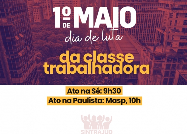 No dia de luta das trabalhadoras e trabalhadores: 1º de maio, o Sindicato convida servidoras e servidores para dois atos que serão realizados na capital paulista. A CSP-Conlutas, Central à qual o Sintrajud é filiado, promove o Ato Primeiro de Maio Classista e Internacionalista, com concentração às 10h no Vão Livre do Masp. Já a Pastoral Operária fará o Ato I de Maio Classista e de Luta, na Praça da Sé, a partir das 9h30. Também foram programados outros Atos dos quais o Sindicato não vai participar, pois terão a presença de governos e patrões. Confira as principais reivindicações dos Atos com apoio do SintrajudAto I de Maio Classista e de Luta, Pastoral Operária- Em defesa dos/as trabalhadores/as, com independência dos governos e dos patrões;- Em defesa das condições de viver bem dos/as trabalhadores/as, com trabalho e salários dignos, para a sobrevivência;- Contra todas as privatizações!Ato Primeiro de Maio Classista e Internacionalista, da CSP-Conlutas- Fim da escala 6x1, redução da jornada de trabalho sem redução de salários!- Aumento dos salários de acordo com a inflação dos alimentos! Gatilho salarial já!- Isenção já dos R$ 5 mil do IR, com correção monetária!- Demarcação e titulação já de todas terras indígenas e quilombolas! Não ao Marco Temporal!- Reforma agrária já! Despejo Zero e moradia digna!- Combater de verdade a crise climática. Defender as florestas e o Ibama. Não à exploração de petróleo na Margem Equatorial! Basta de transformar a floresta amazônica e o cerrado em pasto e plantação de soja. A maioria dos dirigentes do Sintrajud estão participando do 12º Congrejufe e por este motivo não poderão estar presentes nos Atos citados.