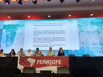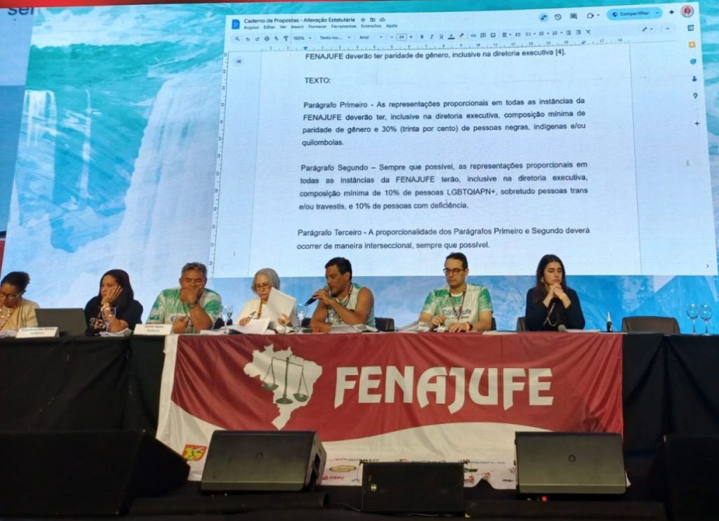 Causou grande comoção a instituição das reservas de vagas para negras e negros, pessoas com deficiência e LBGTQIAPN+ em todas as instâncias da Fenajufe, aprovada na plenária ocorrida na tarde desta terça0-feira (29 de abril) no 12º Congresso da Fenajufe.Maria Ires, integrante do LutaFenajufe e diretora de base do Sintrajud, comemorou a conquista articulada pelo Coletivo de Pretas e Pretos que se organizam na Federação Nacional, ressaltando a importância da inclusão de cotas para negros, indígenas, LGBTQIAPN+ e pessoas com deficiência (PCD). “A aprovação da resolução traz justiça para a participação das representações de opressões dentro das instâncias da Fenajufe. É muito importante porque estamos sempre sendo esquecidos dentro dos espaços. Nós existimos. Não queremos que pessoas que não sentem a nossa dor tracem políticas para a gente. Queremos ocupar os nossos espaços com legitimidade. E quem realmente vai falar por nós somos nós mesmos, porque sabemos qual é a nossa dor. Isso não só nas questões de raça, mas também os LGBTQIAPN+, os PCDs. Cada um fala enquanto grupo e com lugar de fala”, esclareceu.Com a aprovação, o novo texto estatutário, a partir das próximas eleições, as representações proporcionais em todas as instâncias da Fenajufe deverão ter, inclusive na diretoria executiva, composição mínima de paridade de gênero e 30% de pessoas negras, indígenas e/ou quilombolas, 10% de pessoas LGBTQIAPN+, sobretudo pessoas trans e/ou travestis, e 10% de pessoas com deficiência.No parágrafo único do artigo 10 já constava a paridade de gênero. O quarto parágrafo do artigo 5 do regimento eleitoral também já previa o mínimo de 30% de vagas para negros/as e 50% para mulheres nas chapas apresentadas para concorrer à diretoria executiva da entidade.Um dos articuladores da nova redação, o servidor do TRT-2 Filipe Mafalda avalia que a deliberação foi "histórica. A gente consequiu aprovar a equidade de raça, de pessoas negras, indígenas e quilombolas, de pessoas com deficiências e pessoas LGBTQIA+, especialmente pessoas trans e travestis".