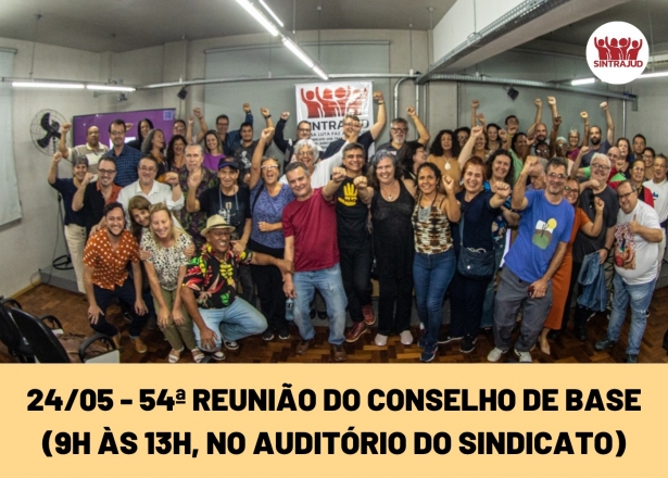 Os/as diretores/as de base ou mesmo colegas sem mandato que desejarem levar faixas, cartazes e panfletos para seu local de trabalho no dia da reunião devem indicar as quantidades no formulário de inscrição para que sejam impressos materiais na quantidade necessária e sem desperdício.Confira o calendário de lutas aprovado no 12º Congrejufe e atividades organizativas do Sintrajud:19/05 - Ato híbrido TRE, às 14h19/05 - Audiência pública em defesa do oficialato (Plenário José Bonifácio da Alesp, às 19h)21/05 - Assembleia Geral (on-line, às 19h30)23/05 - Pressão no CSJT por isonomia na distribuição dos recursos orçamentários para a assistência em saúde de magistrados/as e servidores/as (9h, em Brasília)24/05 - 54ª Conselho de Base (9h às 13h, no auditório do Sindicato)28/05 - Dia nacional de paralisação (ato no TRF, 14h)29/05 - Reunião do Núcleo de Servidores/as com Deficiência (20h, on-line)11/06 - Reunião do Núcleo dos Oficiais de Justiça (on-line, às 19h30)11/06 - Reunião do Núcleo da Polícia Judicial (on-line, às 20h)26/06 - Reunião do Núcleo de Servidores/as com Deficiência (20h, on-line)30/06 a 04/07 - Indicativo de greve nacional pelo PCCSVeja abaixo o edital de convocação do Conselho:EDITAL DE CONVOCAÇÃO DA 54ª REUNIÃO DO CONSELHO DE BASE DO SINTRAJUDO Sindicato dos Trabalhadores do Judiciário Federal no Estado de São Paulo – SINTRAJUD, por seus coordenadores gerais, conforme o Estatuto Social da Entidade (conforme parágrafo 1º do artigo 25), faz saber que fará realizar a 54ª REUNIÃO DO CONSELHO DE BASE DO SINTRAJUD, no dia 24 de maio do ano corrente, a partir das 9 horas, em primeira convocação – no auditório do SINTRAJUD, situado a Rua Antônio de Godói, nº 88, 15º andar, Centro, São Paulo – SP. Haverá possibilidade de participação por Zoom: https://sintrajud-org-br.zoom.us/j/88326034119?pwd=1JvF3ekLbHnn78E7tOvptnB2QeLZpO.1Pauta/programação:9h: Credenciamento 9h30: a) Informes e debates das resoluções do 12º Congrejufe e Campanha pelo PCCS em defesa da Carreira, Salários, Saúde e Direitos. b) Calendário de mobilização nacional:- 28 de maio: Dia nacional de paralisação e mobilização nos estados;
