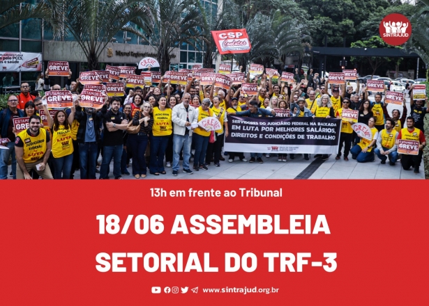 Acontece nesta quarta-feira (18 de junho), às 13 horas, assembleia setorial presencial de servidores e servidoras do Tribunal Regional Federal da 3ª Região. A atividade vai debater a deliberação do 12º Congresso Nacional da categoria, que indicou iniciar greve nacional por tempo indeterminado na semana de 30 de junho a 04 de julho, em defesa da aprovação do projeto de reestruturação da carreira. Também está na pauta da construção da greve em São Paulo a isonomia na distribuição dos recursos orçamentários da assistência em saúde para magistrados/as e servidores/as e a reforma administrativa interna promovida via ‘Justiça 4.0’, ‘Residência Jurídica’ e outros projetos de “fazer mais com menos”. A assembleia vai discutir como o 'arcabouço fiscal' limita direitos dos/as trabalhadores/as enquanto libera geral para juízes/as parlamentares e banqueiros/as.