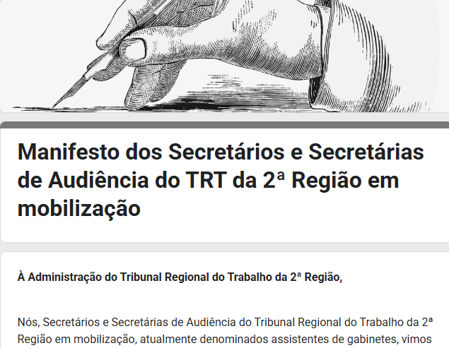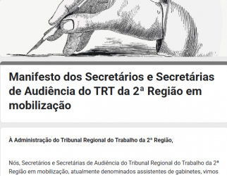 Secretários e secretárias de audiências do Tribunal Regional do Trabalho da 2ª Região estão coletando assinaturas a um manifesto que organiza as reivindicações do segmento e apresenta propostas de diálogo à administração regional. O texto destaca que as condições ambientais e demandas sem efetivo de pessoal adequado estão adoecendo trabalhadores e trabalhadoras na Justiça do Trabalho em alguns casos, o que é em si um contrassenso com a função social do ramo. Por isso, reivindicam estudo aprofundado da carga de trabalho para uma distribuição mais equitativa das tarefas.Equipamentos e mobiliário adequados, solução para as recorrentes falhas dos sistemas PJe e Aud4 e organização das funções comissionadas específicas para as atividades inerentes à Secretaria de Audiências também estão nos destaques do manifesto.O apoio do Tribunal à valorização da carreira e sensibilidade à greve nacional são outras demandas do texto, no qual secretários e secretárias pedem também a criação de um grupo de trabalho para identificar e detalhar os problemas da função, além de organizar os encaminhamentos aos setores responsáveis para a formulação e implementação de soluções eficazes e duradouras.