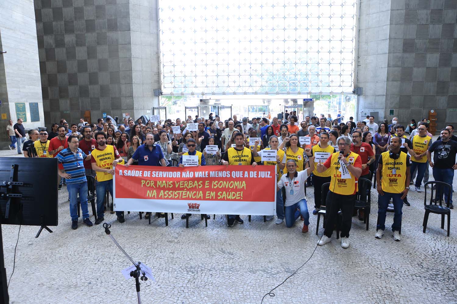 Servidores e servidoras do TRT-2, em greve no dia de hoje e até a próxima quarta, já têm uma primeira vitória importante da luta para comemorar em meio às atividades da paralisação. Depois de sete dias de paralisações e inúmeros atos que recuperaram o reconhecimento de que a saúde de servidores não vale menos que a de juízes, e seguirão mobilizados para que essa vitória não seja revertida pelo Grupo de Trabalho do CSJT. A diretoria do Sindicato ressalta que a para a isonomia voltar a se efetivar definitivamente é fundamental que a luta se mantenha e cresça.* Texto alterado às 13h05 de 30/06/2025, para inclusão de esclarecimento sobre como funciona o orçamento per capita para a assistência em saúde.