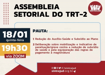 O Sintrajud convoca assembleia setorial para esta quinta-feira, 18 de janeiro, para discutir a redução do Auxílio-Saúde e subsídio ao plano no Trabalhista, constatada nos contracheques de servidoras e servidores neste mês de janeiro. A setorial irá deliberar sobre mobilização, paralisação ou greve, entre outras ações, perante decisão do Tribunal, que, para o Sindicato, ataca o direito à saúde dos servidores. Assembleia acontecerá a partir das 19h30, via plataforma Zoom.