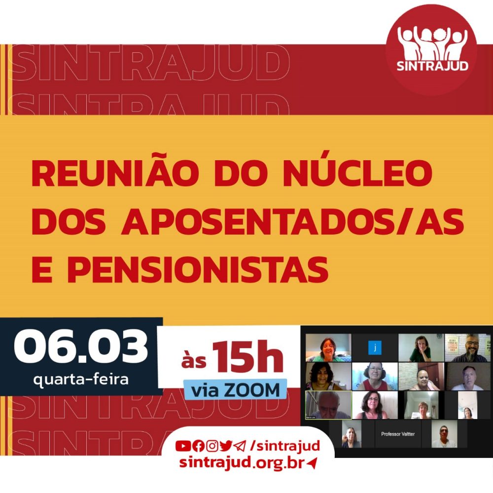 A reunião do Núcleo de Aposentadas, Aposentados e Pensionistas do Sindicato desta quarta-feira, 6 de março, é a primeira do ciclo semanal de encontros de 2024. A atividade é aberta à participação de servidores aposentados/as e pensionistas de todos os ramos do Poder Judiciário da União e ocorrerá via Zoom, às 15 horas. Em pauta, a luta em defesa da saúde, da carreira e a elaboração do calendário de ações para 2024. Acesse aqui a sala virtual da reunião do Núcleo