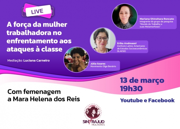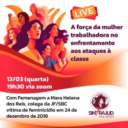 Após o ato na Av. Paulista que marcou o 8M e roda de conversa sobre defesa pessoal e aula de vôlei de areia recreativo no dia 9, o Coletivo de Mulheres Mara Helena dos Reis e Sintrajud realizam neste dia 13 (quarta-feira) live “A força da mulher trabalhadora no enfrentamento aos ataques à classe”, às 19h30, pelo Youtube e Facebook do Sindicato.