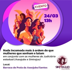 Devido a questões operacionais, a atividade que estava prevista para ocorrer na cidade de Santos no próximo dia 24 de março está cancelada. A diretoria do Sintrajud pede desculpas aos interessados e às interessadas, mas não será possível realizar o evento naquela data. Tão logo seja marcada nova iniciativa do Coletivo de Mulheres do Sintrajud - Mara Helena dos Reis na Baixada Santista a categoria será informada.
