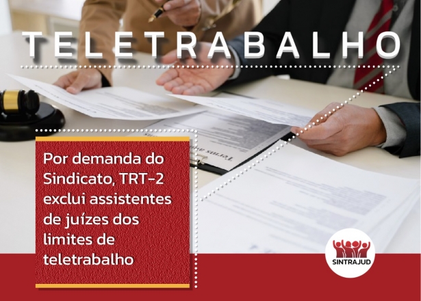 Após o Sintrajud requerer a aplicação imediata do direito, o Tribunal Regional do Trabalho da 2ª Região passará a assegurar a todos/as os/as assistentes de juiz de 1º grau o direito ao teletrabalho. Com a decisão, esses colegas passam a não contar mais nos 30% limites de servidores/as prestando serviço a distância em cada unidade judiciária.