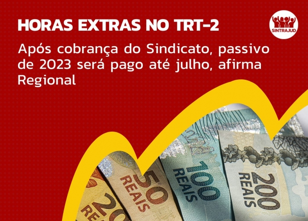 Conforme noticiado, o Sindicato havia requerido ao Tribunal Regional do Trabalho da 2ª Região o pagamento de horas extras devidas do exercício de 2023, especialmente nos últimos meses, em vista do grande volume de trabalho executado nas unidades administrativas. O valor total devido, segundo a administração, é de R$ 90.102,09 (noventa mil, cento e dois reais e nove centavos) para 82 (oitenta e duas) pessoas. De acordo com o diretor-geral, Rômulo Araújo, “tão logo seja autorizado, esta Administração providenciará o pagamento da totalidade dos créditos”.