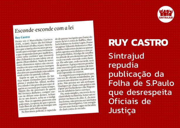 Foi publicado na versão on-line do jornal 'Folha de S.Paulo' deste dia 27 de junho e na edição impressa desta sexta, 28, um artigo assinado pelo jornalista Ruy Castro, sob o título “Esconde-esconde com a lei”, no qual o articulista comenta a inaceitável e absurda conduta de Marcelinho Carioca e Eduardo Bolsonaro, que tentam burlar o sistema legal evitando serem encontrados para receberem intimações. Causa surpresa e indignação que o articulista não tenha se solidarizado com as condições de trabalho dos Oficiais de Justiça, nem destacado o uso e abuso de poder e dinheiro por parte de Marcelinho Carioca e de Eduardo Bolsonaro para evitar a Justiça. Ao invés disso, lançou ataques aos Oficiais de Justiça. Quando deveria analisar profundamente as condições de trabalho destes imprescindíveis servidores públicos, ou dissertar sobre como ricos e poderosos buscam fugir da Justiça, o articulista optou em desrespeitar e atacar os servidores, comparando-os a “palermas” e qualificando-os como “sonâmbulos”, somando-se desta forma àqueles que atacam o Poder Judiciário no Brasil, usando como alvo os servidores públicos. O jornalista não buscou saber o quanto os Oficiais de Justiça se sacrificam para garantir o cumprimento das decisões judiciais. Ao atacar aqueles que se expõem a agressões físicas e tentativas, ou até mesmo homicídios no exercício das funções, que usam veículo próprio em serviço, que têm de respeitar os limites da atuação dentro da Lei, Ruy reforça o exercício de ricos e poderosos que se julgam acima da lei, e presta um desserviço. Durante a pandemia, como inúmeras outras categorias do setor público, os Oficiais de Justiça estiveram entre aqueles mais vitimados pela Covid-19 porque foram obrigados a manter a atividade externa para garantir que não houvesse perecimento de direito e se cumprissem as ordens judiciais. Nas operações de combate ao crime organizado e ao narcotráfico são os Oficiais de Justiça, sozinhos ou sozinhas, o "braço da lei" que realiza a intimação. Não, os Oficiais de Justiça não são personagens de um romance idealizado pelo autor, inspirado em detetives que podem agir à margem da lei para lograr sucesso. O Estado não pode atuar a não ser dentro dos limites estabelecidos pela legislação, sob o risco de se igualar a quem a descumpre. E não pode ser o Oficial de Justiça, elo mais fraco desta engrenagem, a cumprir tal papel. O Sintrajud além de repudiar a publicação soma-se à exigência de que seja garantido o direito de resposta para que a realidade do exercício funcional dos Oficiais de Justiça seja exposta e, assim, de alguma forma o jornal e o autor se retratem pelo injusto ataque ao Oficialato. São Paulo, 28 de junho de 2024. Diretoria Executiva do Sintrajud
