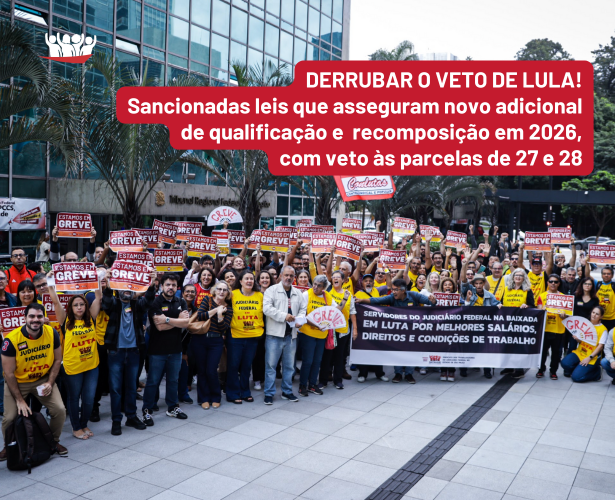 No último dia do ano antes do recesso judiciário, foram finalmente sancionadas pela Presidência da República as leis que garantem o reajuste salarial de 8% julho de 2026 e a nova forma cálculo do adicional de qualificação (AQ). O governo Lula/Alckmin, no entanto, vetou as parcelas previstas para 2027 e 2028 no texto enviado pelo Supremo.