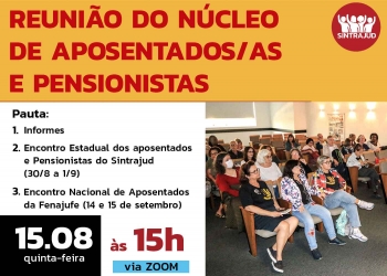 Após uma semana da jornada de importante mobilização e paralisação em defesa do anteprojeto de reestruturação da carreira (PCCS), que contou com participação do segmento em São Paulo e em Brasília, a reunião do Núcleo de Aposentados, Aposentadas e Pensionistas do Sintrajud acontece nesta quinta, 15 de agosto, de forma virtual (via Zoom). Ao final, haverá aula de dança.