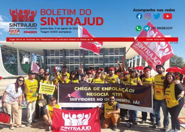 Saiu do forno a nova edição do Boletim do Sintrajud, neste dia 21 de agosto de 2024. A publicação destaca a exigência da categoria de abertura de negociação sobre o anteprojeto de Cargos, Carreira e Salários, com as últimas informações sobre a busca de diálogos com a cúpula do Poder e as avaliações da diretoria do Sindicato.