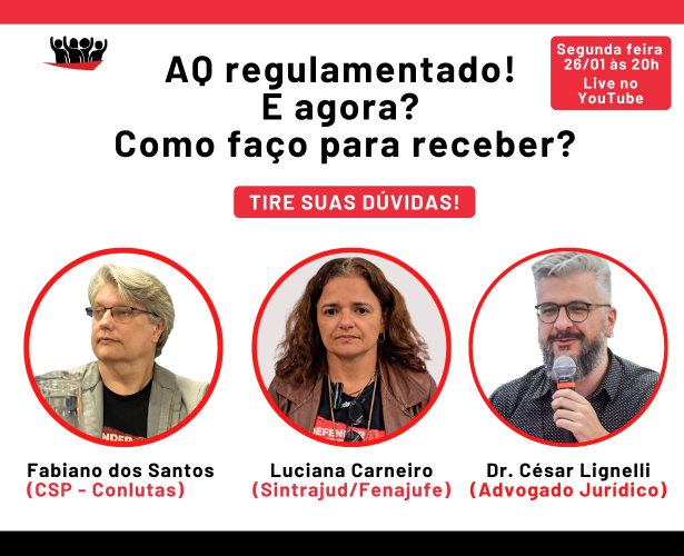 “AQ regulamentado! E agora? Como faço para receber?”. O Sintrajud realizará na segunda-feira, 26 de janeiro de 2026, a partir das 20 horas, uma live para tirar dúvidas sobre o Novo Adicional de Qualificação, conquistado em dezembro do ano passado pela luta dos servidores e servidoras do Judiciário Federal.