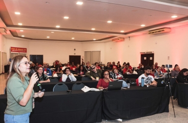 A advogada Eliana Ferreira, coordenadora do deptº Jurídico do Sindicato, apresenta durante o Encontro Estadual a legislação que protege o exercício da atividade sindical no serviço público (Fotos: Joca Duarte).