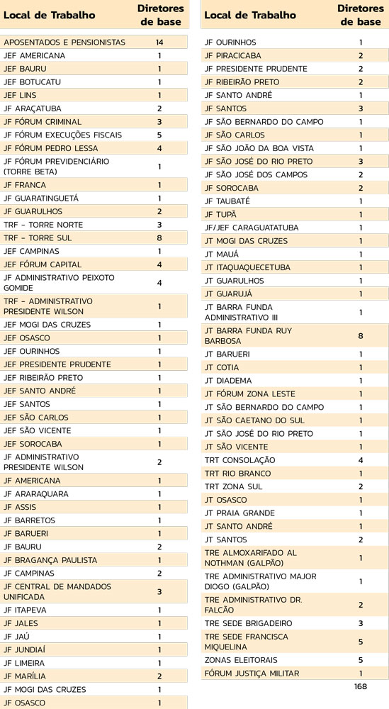 Após dois dias de intensos debates no Encontro Estadual de Base realizado de 18 a 20 deste mês em Atibaia, no interior do estado, a diretoria do Sintrajud convoca oficialmente as eleições para composição do Conselho de Base do Sindicato. A votação vai acontecer nos dias 18 e 19 de novembro, em formato 100% digital. De hoje até o dia 30 de outubro, sindicalizadas e sindicalizados podem se inscrever para concorrer a uma das 168 vagas que poderão ser ocupadas em todo o estado (veja a tabela).Como se candidatar?