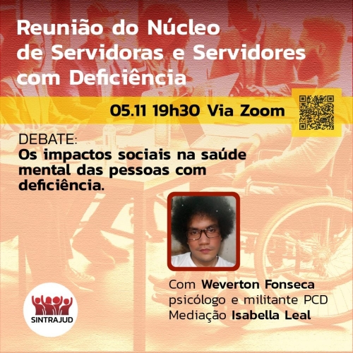 Sintrajud realiza reunião do Núcleo das Servidoras e Servidores com Deficiência no próximo 5 de novembro (terça-feira), em formato on-line (via Zoom), às 19h30. Como de costume, a atividade vai contar com o debate “Os impactos sociais na saúde mental das pessoas com deficiência”, com Weverton Fonseca, que é psicólogo e militante da luta anticapacitista. Informes de interesse do segmento também serão apresentados no encontro.