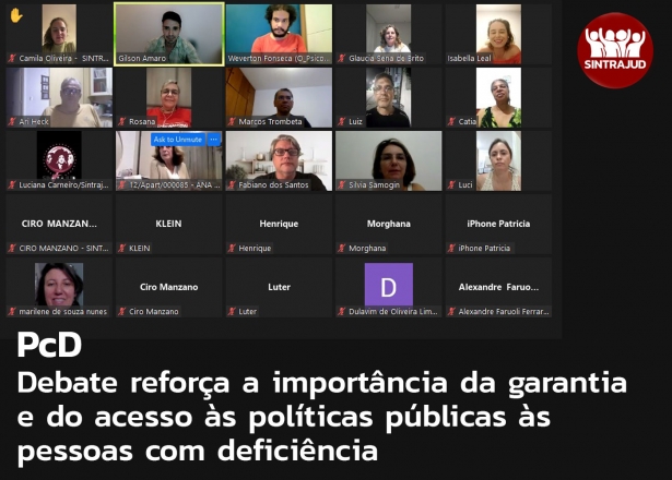 O Núcleo de Servidores/as com Deficiência do Sintrajud, em reunião virtual, debateu os impactos sociais na saúde mental das pessoas com deficiência. A atividade, que reuniu servidores do PJU, dirigentes sindicais de outros estados e da Fenajufe, contou com a participação do psicólogo e integrante do Quilombo PcD Weverton Fonseca. O encontro foi mediada pela diretora Isabella Leal, coordenadora do núcleo.