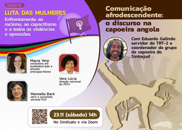 Às 14 horas, o painel “Luta das mulheres – enfrentamento ao racismo, ao capacitismo e a todas as violências e opressões” reúne a jornalista, professora e atriz Manoella Back, a militante anticapacitista Mayra Oliveira e Vera Lúcia Salgado, mulher negra ex- candidata à Presidência da República e integrante da direção nacional do PSTU. A mediação será feita pelas coordenadoras do Coletivo de Mulheres Luciana Carneiro (TRF-3) e do Núcleo PCD, Isabella Leal (TRT-2).