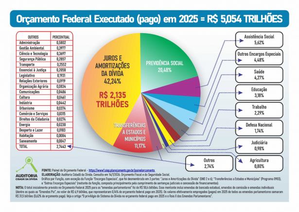 A auditora fiscal aposentada Maria Lúcia Fattorelli, coordenadora da Auditoria Cidadã, destacou que o crescimento acelerado da dívida interna federal brasileira, que superou o patamar de R$ 11 trilhões em 2025, não tem qualquer contrapartida em investimentos e decorre de juros sobre juros e mecanismos financeiros. Pelos dados da Auditoria, o estoque total da dívida interna federal em dezembro de 2025 correspondia a R$ 11,169 trilhão, e a dívida externa total chegada a US$ 651,656 bilhões. No mesmo ano, os juros e amortizações da dívida pública teriam consumido R$ 2,135 trilhões, o equivalente a 42,4% do orçamento federal executado.
