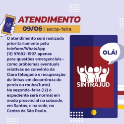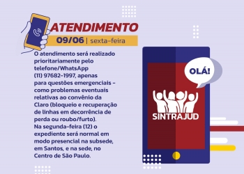 Não haverá atendimento no feriado nacional de Corpus Christi, 8. E no dia seguinte, sexta (9), o Sintrajud funcionará de forma remota, das 9h às 18h.