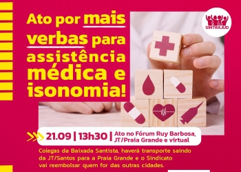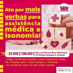 A luta segue por mais verbas para saúde, previsibilidade e isonomia entre juízes e servidores, diz o Sindicato, sob o mote "A Saúde de servidor não vale menos que a de juiz. Por mais verbas e isonomia na assistência em saúde!". Nesta quinta-feira, 21 de setembro, nos Fóruns Trabalhistas Ruy Barbosa e da Praia Grande a categoria vai mais uma vez denunciar o tratamento desigual, em que magistrados recebem benefício maior, a partir das 13h30, em formato híbrido (presencial e online).