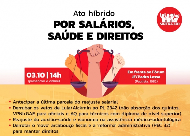 A assembleia vai debater a intensificação mobilização contra os ataques ao funcionalismo e aos serviços públicos, como a ‘reforma’ administrativa (PEC 32) e os do governo Lula/Alckmin ao projeto de lei 2342/2022. Também será discutida a luta pela antecipação da última parcela do reajuste conquistado com a Lei 14.523/2023 e para reverter a paralisia das administrações frente à alta dos preços dos planos de saúde no Judiciário Federal. Estarão em pauta, ainda, a reestruturação produtiva no PJU, com projetos como as Centrais de Processamento Eletrônico (CPEs) e ‘Justiça 4.0’, e o calendário definido pelo Fórum das Entidades Nacionais dos Servidores Federais (Fonasefe).