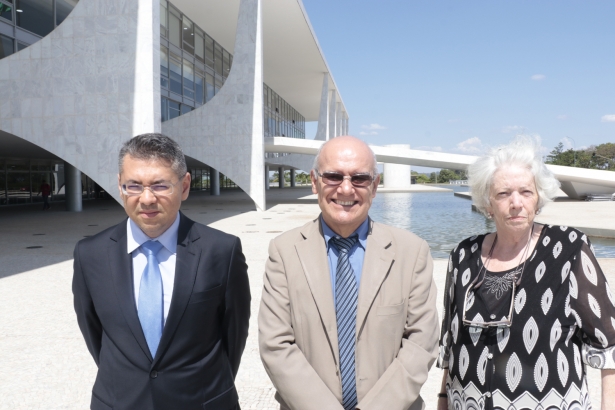 Os dirigentes do Sintrajud Marcos Trombeta e Antonio Melquíades e a servidora Elizabeth Zimmermann, do SindMPU