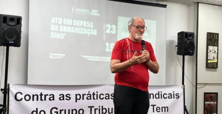 Contra as demissões arbitrárias dos diretores do Sindicato dos Jornalistas (SJSP) Sandro Thadeu e Sérgio Pais, o Sintrajud se uniu ao ato pela reintegração dos dirigentes, na noite desta quinta-feira, 23 de novembro, no Auditório Vladimir Herzog, localizado à Rua Rego Freitas, 530, no Centro de São Paulo.