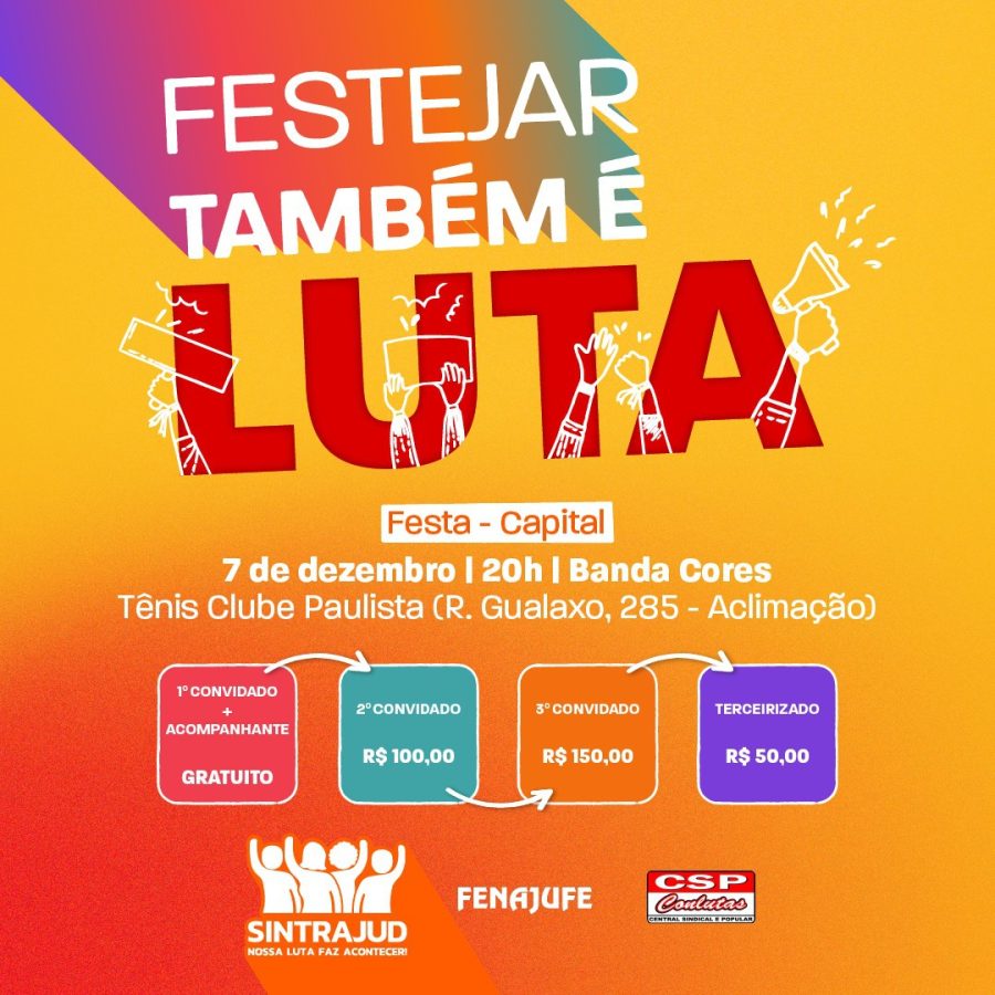 Festejar também é luta e na comemoração, servidores e convidados terão direito a buffet e bebidas à vontade (cerveja somente para maiores de 18 anos); o evento é gratuito para servidores sindicalizados, que têm direito, também gratuitamente, a um convidado. Para adquirir um segundo convite, o ingresso custa R$ 100,00 e, a partir do terceiro, R$ 150,00. A atração musical ficará por conta da Banda Cores.