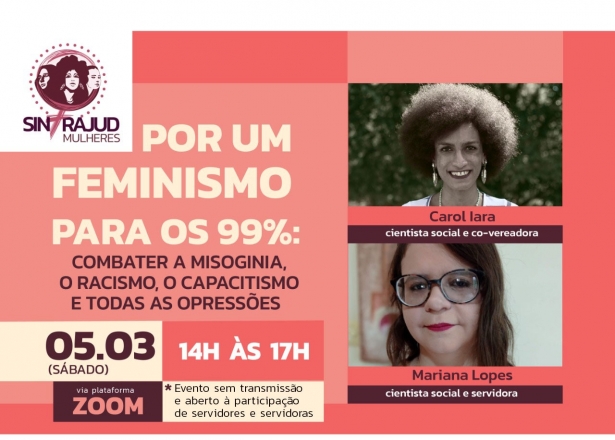 Para marcar as atividades de março, mês internacional de luta das mulheres, neste sábado, dia 5, o Coletivo de Mulheres do Sintrajud – Mara Helena dos Reis, realizará o seminário “Por um feminismo para as 99%: combater a misoginia, o racismo, o capacitismo e todas as opressões”. A atividade acontece das 14h às 17h, de forma remota, por meio da plataforma Zoom, e será aberta à participação de mulheres e homens da categoria, funcionários do Sindicato e convidados de outras categorias, mas não haverá transmissão ao vivo.