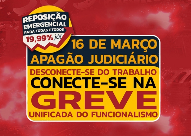 Está chegando o dia da paralisação nacional de todas as categorias do serviço público federal em defesa do reposição emergencial de 19,99% (perdas acumuladas nos três anos de governo Bolsonaro, quando nenhuma categoria teve qualquer tipo de reajuste). Na próxima quarta-feira, 16 de março, a categoria judiciária em São Paulo decidiu em assembleia realizar um 'Apagão' dos serviços, que consiste em não acessar nenhum sistema e nem e-mails funcionais para quem está em trabalho remoto e não comparecimento ao local de trabalho para quem está no regime presencial. Não esquecer de comunicar a sua chefia imediata a adesão ao movimento e o Sindicato já formalizou a decisão da assembleia às administrações.