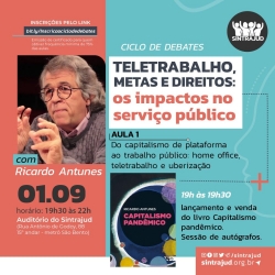 Como parte do enfrentamento à Resolução 514, além de diversos atos e assembleias, a categoria avaliou a necessidade de debater de forma mais aprofundada os impactos do teletrabalho e das novas tecnologias no dia-a-dia do serviço público. Para atender a esta demanda, a diretoria do Sindicato organizou o do Ciclo de Debates Teletrabalho, metas e direitos: os impactos no serviço público, que será realizado presencialmente no auditório da entidade todas as quintas-feiras de setembro (1º, 8, 15, 22 e 29), das 19h30 às 22h.