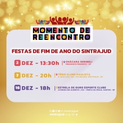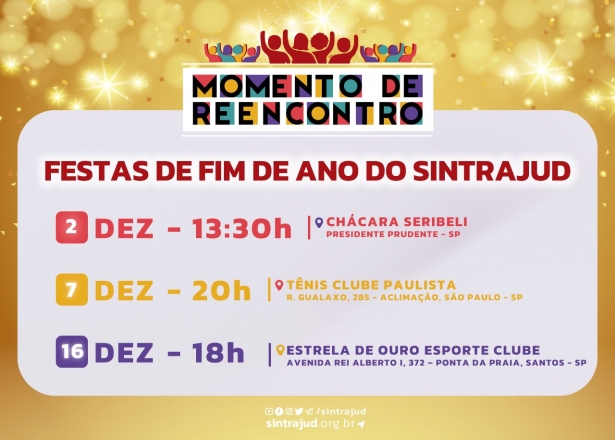 As tradicionais festas de fim de ano do Sintrajud estão de volta ao formato presencial, sob o tema do “Momento de Reencontro”. Após mais de dois anos de distanciamento social imposto pela pandemia de covid-19 e observando as regras sanitárias para a proteção dos participantes, os eventos vão celebrar a vida, a saúde e o início de um novo período para servidores e servidoras.