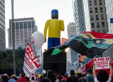 Um boneco gigante com o uniforme dos Correios pairou sobre os manifestantes na Paulista e simbolizou a defesa da estatal contra o projeto de privatização, que tramita na Câmara dos Deputados. “O governo Bolsonaro quer privatizar uma estatal que tem mais de 358 anos e atende a todos os municípios”, declarou Paulo Cesar Almeida, diretor da federação nacional dos trabalhadores da empresa (Fentect) e dirigente da CSP-Conlutas.