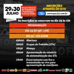 Organizado pelo Fórum dos Servidores Públicos das Centrais Sindicais, o Encontro Nacional dos Trabalhadores e Trabalhadoras do Serviço Público contará com a participação de convidados e será aberto com uma live nesta quinta-feira, 29, às 19 horas. Haverá transmissão pela página do Sintrajud no Facebook e pelas páginas do site "Contra a PEC 32" no Facebook e no YouTube.