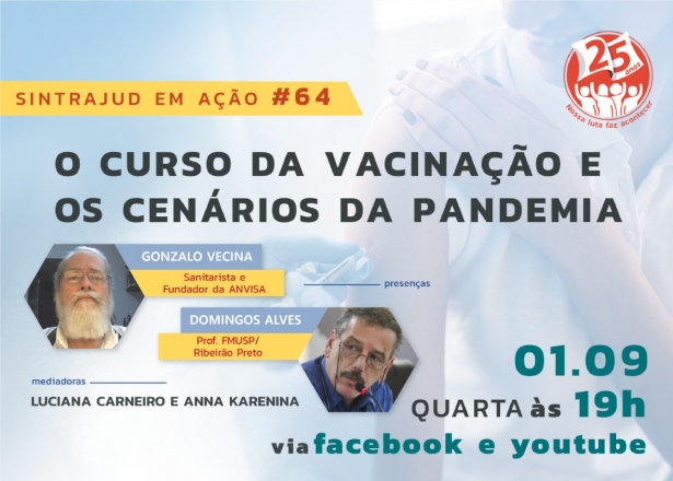 O atual cenário da pandemia de covid-19 no Brasil, diante do avanço da vacinação mas também do aumento dos índices de contaminação e internações, e as consequências do fim de medidas restritivas e de distanciamento social, serão temas debatidos na 64ª live realizada pelo Sintrajud desde o início da pandemia. A transmissão ao vivo acontece no dia 1º de setembro (quarta-feira), às 19h, nas páginas do Facebook, YouTube do Sindicato e aqui pelo site.