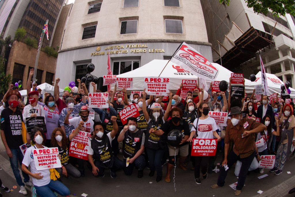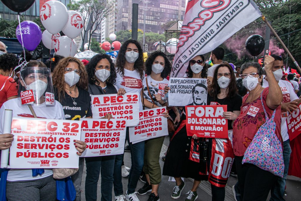 Além do impeachment do Presidente da República que ameaça a democracia e ataca os direitos dos brasileiros, os manifestantes levaram diversas pautas para as ruas – os protestos aconteceram em pelo menos 304 cidades brasileiras e em 18 países, de acordo com levantamento realizado pelas entidades organizadoras, reunindo cerca de 700 mil pessoas. A rejeição da PEC 32/2020, a “reforma” administrativa que tramita na Câmara dos Deputados, foi defendida pelos servidores do Judiciário Federal e por muitas outras categorias do funcionalismo público.