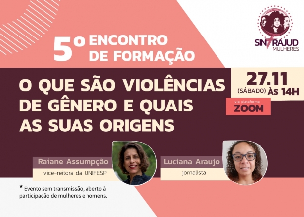 Neste sábado, 27 de novembro, o Coletivo de Mulheres do Sintrajud – Mara Helena dos Reis, realizará o seminário “O que são violência de gênero e quais suas origens?”. A atividade que dá seguimento ao ciclo de formação sobre o combate ao machismo na sociedade acontecerá via plataforma Zoom, das 14h às 17h, e será aberta à participação de mulheres e homens da categoria, funcionários do Sindicato e convidados de outras categorias, mas não haverá transmissão ao vivo.