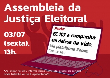 A segunda assembleia setorial online dos servidores da Justiça Eleitoral, para organizar a mobilização em defesa da preservação da vida de servidores e da população que será convocada às eleições municipais deste ano, acontece às 13 horas desta sexta-feira (3 de julho). Após a aprovação da Emenda Constitucional que adia o primeiro e o segundo turnos para 15 e 29 de novembro, respectivamente, a assembleia vai avaliar também o próprio texto de alteração constitucional. A atividade vai ser realizada por meio do Zoom – aplicativo para realização de reuniões virtuais.