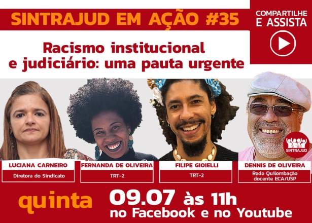 A diretoria do Sintrajud convidou o jornalista Dennis de Oliveira e os servidores do TRT-2 Fernanda de Oliveira e Filipe Gioielli Mafalda. A transmissão também terá a participação da diretora do Sindicato Luciana Carneiro, servidora do TRF-3, e vai abordar também o combate ao racismo institucional no Judiciário Federal.